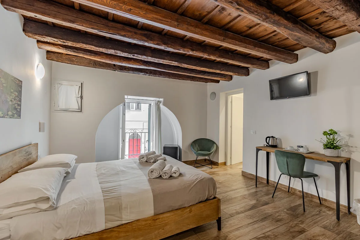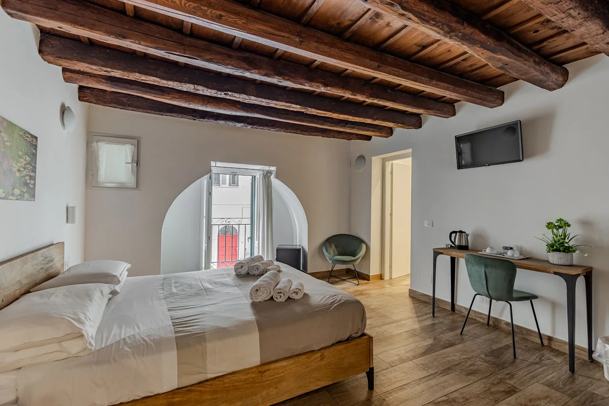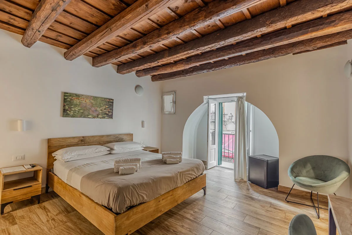 La Suite Kalsa si distingue per le sue travi a vista, che aggiungono un tocco di autenticità e calore all’ambiente, creando un’atmosfera intima e rilassante. La combinazione di elementi architettonici tradizionali e un design moderno rende questa suite un luogo unico e speciale per il tuo soggiorno a Palermo.