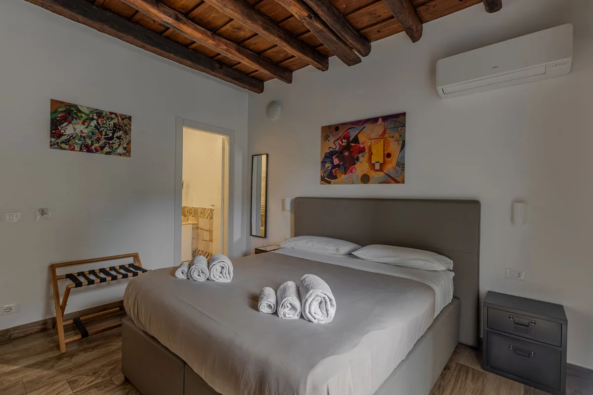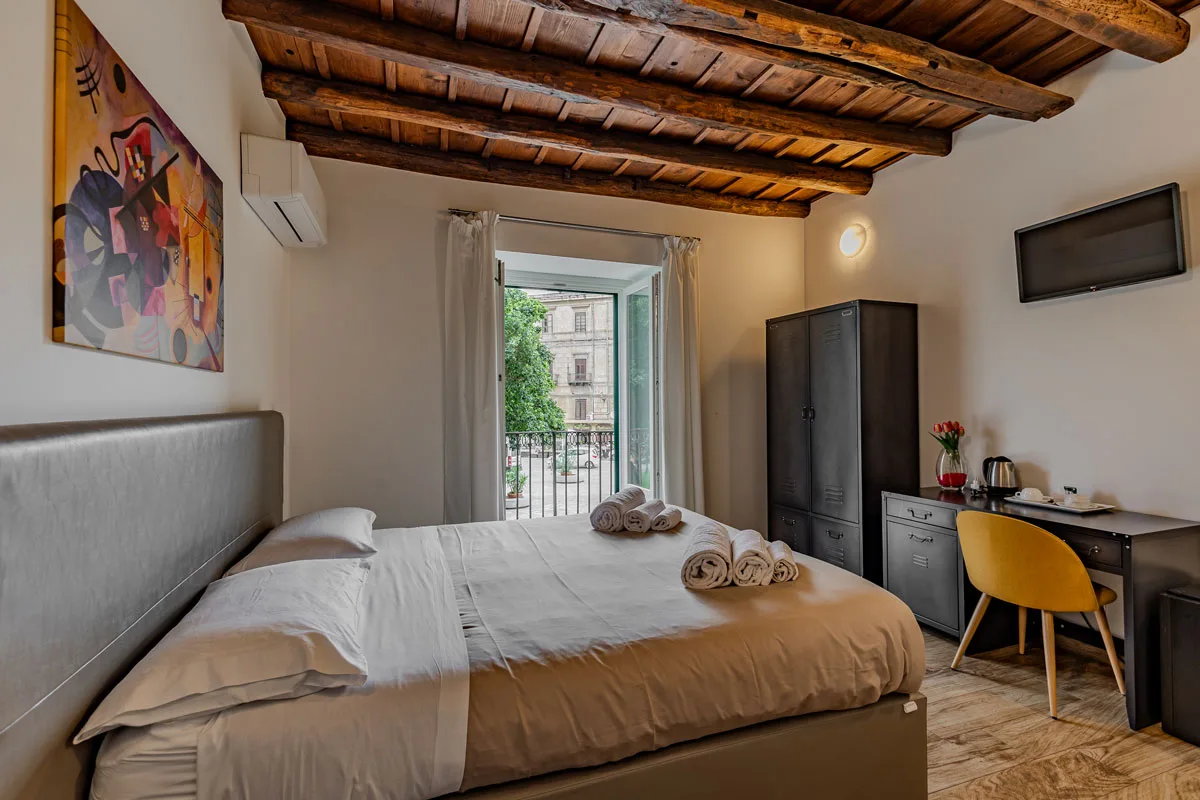 Immergiti nell’atmosfera unica di Palermo soggiornando nella camera Piazza Pretoria, una raffinata matrimoniale situata all’interno di Casa Bottai, nel cuore del centro storico di Palermo, in via Bottai. Questa stanza accogliente e luminosa, con travi a vista che evocano il fascino della tradizione, offre tutti i comfort moderni per un soggiorno indimenticabile.