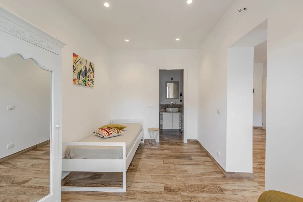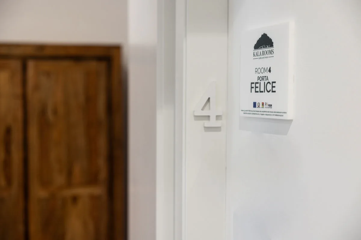 La camera Porta Felice si distingue per la presenza di una parete divisoria che separa il letto matrimoniale dal letto singolo, creando due spazi distinti che offrono maggiore privacy e comfort per gli ospiti. La luminosità naturale e l’arredamento curato completano un’atmosfera rilassante e accogliente.